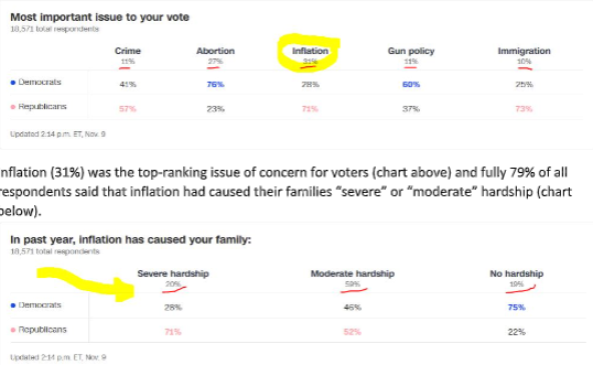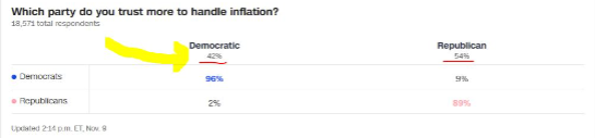 As to which party they expected to solve the problem they ranked most troubling, the GOP was twelve points ahead on “handling inflation”, 54% to 42%. The GOP was more trusted to sort out immigration and crime as well. (“Best handling” of abortion and gun policy cannot be captured in a single question, as the meaning of “handling” these diverges completely depending on one’s political position. So, while 27% of respondents named abortion as the most important issue, the 23% of that which is GOP has a good chance of meaning by that the prohibition of abortion.)