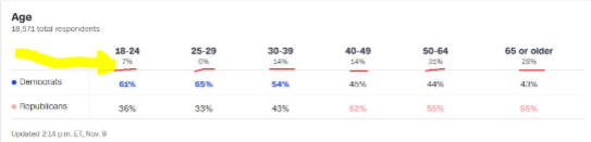 In fact, only 7% of midterm voters were in the 18-24 aged student demographic, and just 12% of midterm voters were in the 18-29 age group at all (it’s 16% of the population-at-large). At the same time, 59% of the midterm voters were in the over-50 age bracket, vastly overrepresenting its 34% share of the actual US population. Young voters were proportionately missing in the mid-terms, though pundits continue to pretend the opposite.