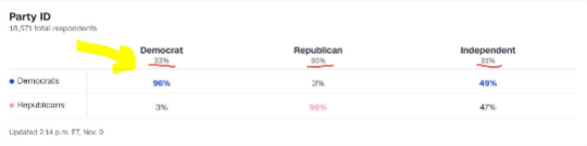 And lastly, if the Democrats had any hope of counteracting the traditional losses by a party-in-power at midterms, let alone the seriously negative poll numbers, they would have to outnumber their GOP adversaries in voting turnout. Did they? In fact, it looks like there were more GOP voters, with Independents splitting between the parties about evenly.