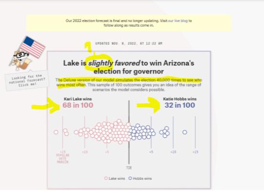 Lake consistently leaned into the flak she took for holding unauthorised views, just like her model, Donald Trump, and the national press corps struck back, covering her invariably with scorn and contempt as an unwanted exotic and “election-denier”. Yet here (see graphic below) is Establishment pollster “FiveThirtyEight” unable quite to make their version of reality stick, showing that running their election-simulation forty-thousand times gives the hated Lake the win 68:32 times in 100, even through Election Day’s last update: