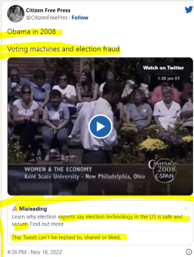 Even social media posts showing Barack Obama himself raising the subject of election-machine failure are being slapped with warning labels: