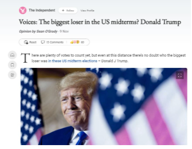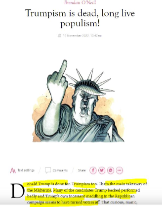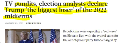 Indeed, the bipartisan Establishment and its mainstream media are pushing their preferred “take-away” of the 2022 midterms, that it was a referendum on Trumpism, and Trumpism lost. (Trump queried this by asking the audience at the Tuesday night announcement of his 2024 candidacy if “232 wins against 22 losses” is really such a bad record.)