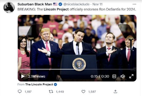 Two last “takes” are significant. First, from the Lincoln Project, recognised as a ruthless, if much-ridiculed, brain trust of “conservatives” and Republican strategists known for their honed and polished singular message of Never-Trump. Please click on the link for their semi-sincere big kiss for DeSantis from the Lincoln Project