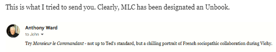 ‘Monsieur le Commandant isn’t the best translated book in the world, but its main merit is in its ruthless presentation of the realities of French arse-licking collaboration during the Second World War. It is hated by the French Enarc class.