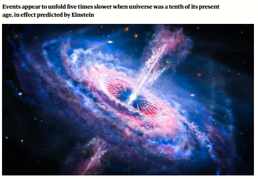 ‘Astronomers observe time dilation in early universe……Astronomers have watched the distant universe running in slow motion, marking the first time that the weird effect predicted by Einstein more than a century ago has been observed in the early cosmos’ (https://www.theguardian.com/science/2023/jul/03/astronomers-observe-time-dilation-in-early-universe)