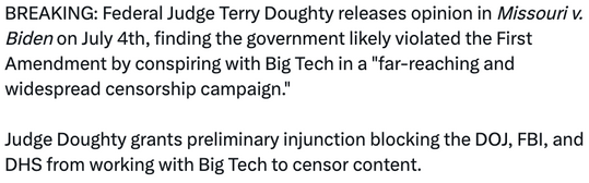 Meryl Nass has since had more to say about it in her substack: ‘Doughty, a conservative nominated to the federal bench by then-President Donald Trump, issued an injunction Tuesday blocking multiple government agencies and administration officials from meeting with or contacting social media companies for the purpose of “encouraging, pressuring, or inducing in any manner the removal, deletion, suppression, or reduction of content containing protected free speech.”