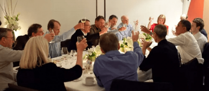 Around an exotic dinner-table shot at the time were the techie billionaires all raising their glasses at a meal organised by the First Black White House President.