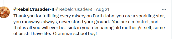 Fast forward to Twitter, and an anodyne tweet I sent to one fairly high-profile lady evoked a ‘like’ from her, but then a follow-up saying she was fed up of me sending miserable tweets and why didn’t I lighten up. This in turn set off a Slog-kicking fest led the author of this gem: