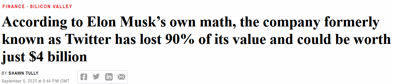 Now read what Establishment publication Fortune has to say: the social medium X has lost so much value, ”the vehicle [Musk] paid $44 billion for is now valued at $4 billion”.