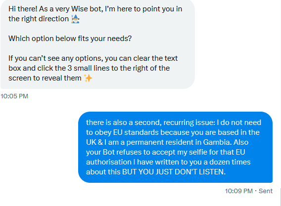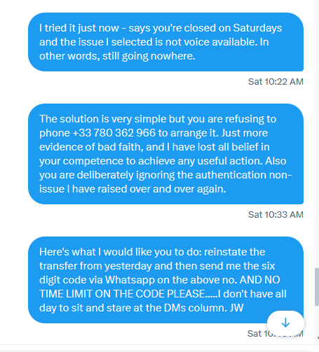 As to the ”up to a point” thing, there now follows a genuine photo-capture of the exchange that took place between Wise and I on Twitter DMs. I suspect it will make you both amused by the flagrantly false rationales and yet also very angry at the obstacles being hastily erected at every turn to confuse the client or justify risible service.
