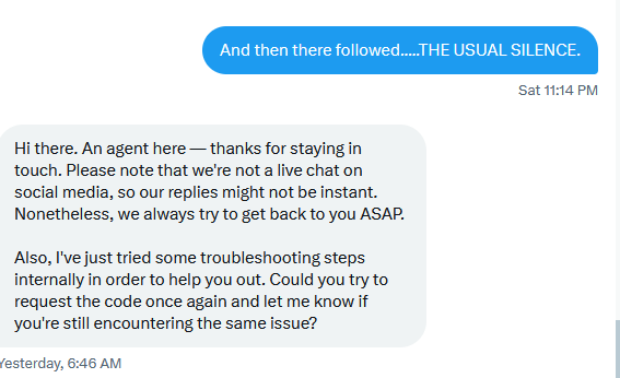 As to the ”up to a point” thing, there now follows a genuine photo-capture of the exchange that took place between Wise and I on Twitter DMs. I suspect it will make you both amused by the flagrantly false rationales and yet also very angry at the obstacles being hastily erected at every turn to confuse the client or justify risible service.