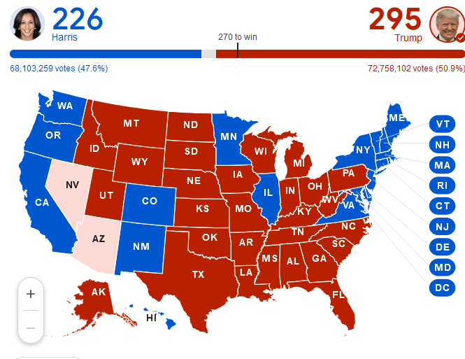 The popular vote may look close at first sight, but Trump is projected to end up five million ahead of Harris. Based on the same projected turnout data, that is is a victory margin closer to 5.4% as opposed to the 2.8% being bandied about by the almost universally anti-Donald media networks.